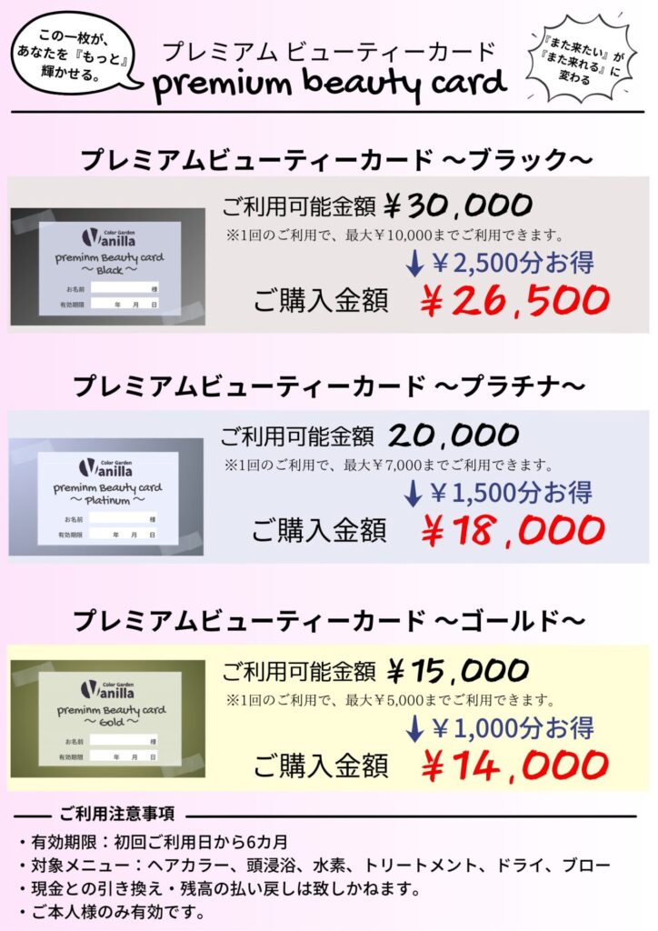 そんな、こまめにヘアカラーを楽しみたい方におすすめなのが、Vanillaプレミアムビューティーカードです。
